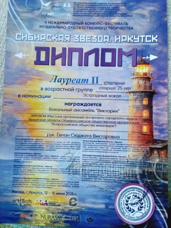 14 июня 2025 года вокальный ансамбль "Виктория" Ангарской местной организации Всероссийского общества инвалидов принял участие в Международном фестивале-конкурсе "Сибирская звезда" при финансовой поддержке фонда "Содействие", проходившем в городе Иркутске на базе дворца культуры "Орбита".